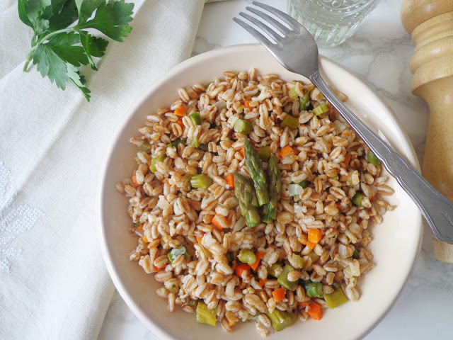 SKŁADNIKI (4 porcje) 200 g ziaren orkiszu lub ryżu orkiszowego*400 g szparagów30…