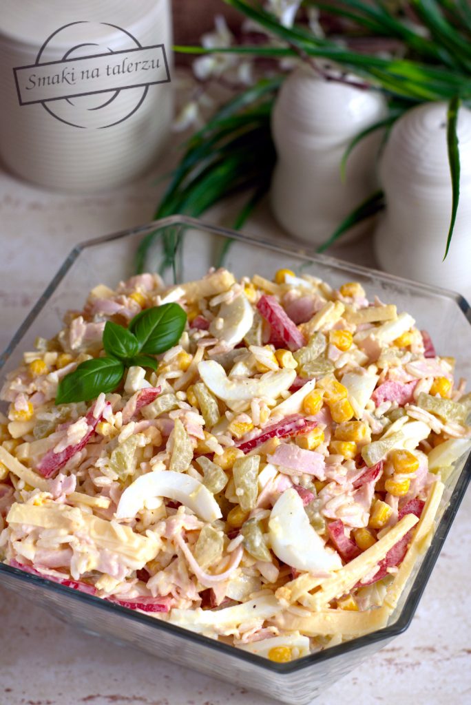 Sałatka na bazie ryżu, jajek ugotowanych na twardo, szynki, żółtego sera, ogórków konserwowych oraz świeżej, soczystej papryki.