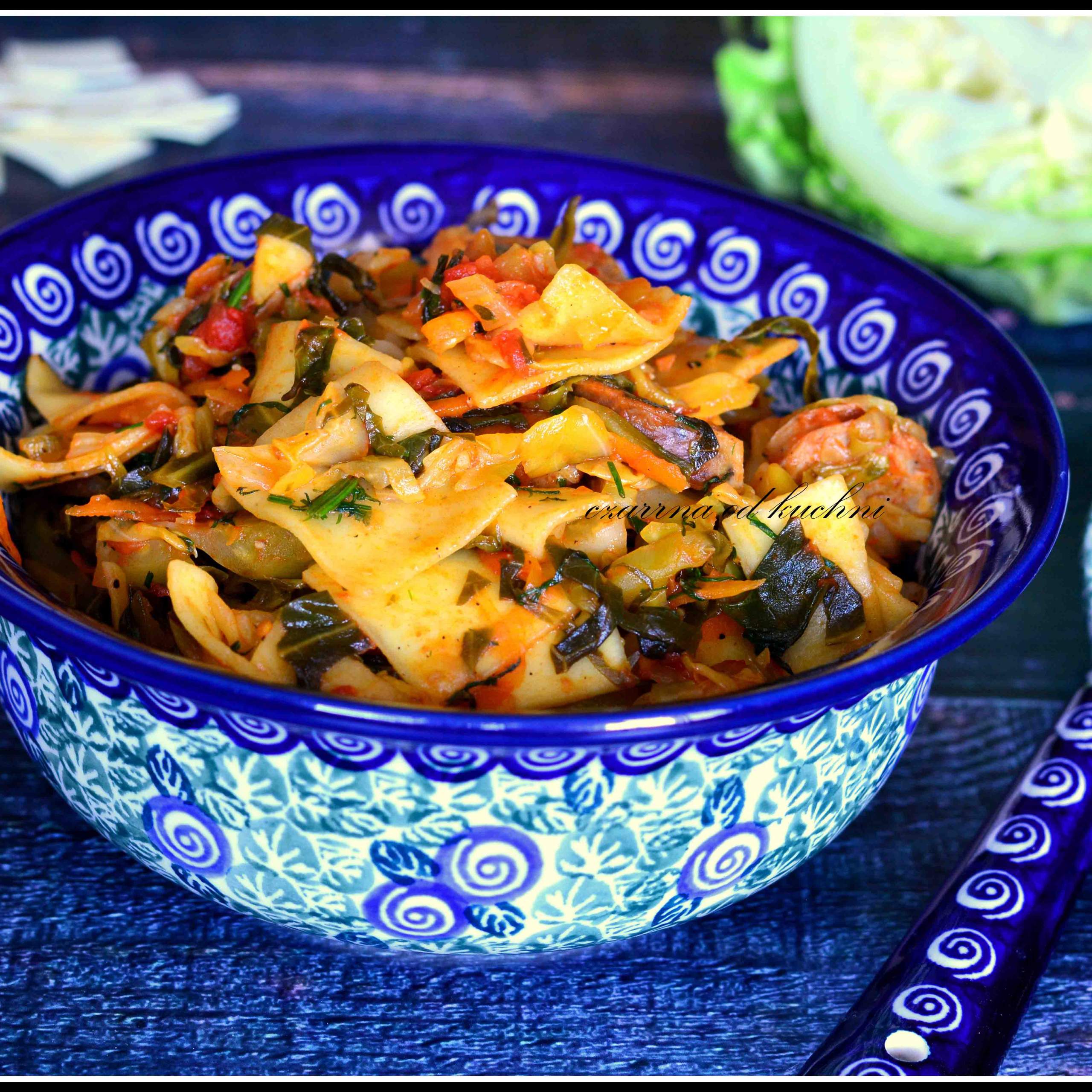 Składniki: 1/2 główki młodej kapusty 150 g makaronu łazanki 1 puszka pomidorów…