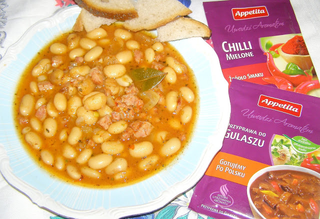fasola jaś 50 dag, ziele angielskie 4 sztuki, liście laurowe 3 sztuki, soda oczyszczona 1 łyżeczka, kiełbasa śląska 4 sztuki, cebula 2 sztuki, ząbki czosnku 5 sztuk, olej rzepakowy 1/2 szklanki, przyprawa do gulaszu Appetita 1 opakowanie, papryka chilli mielone Appetita 1 łyżeczka, cukier 2 łyżki, ocet 10%