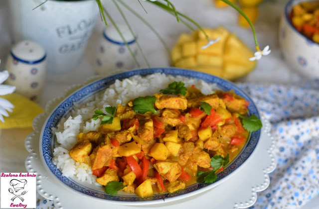 600g fileta z kurczaka 2 czerwona papryki1 cebula2 dojrzałe mango200ml mleczka kokosowego1 łyżeczka pasty chilli4