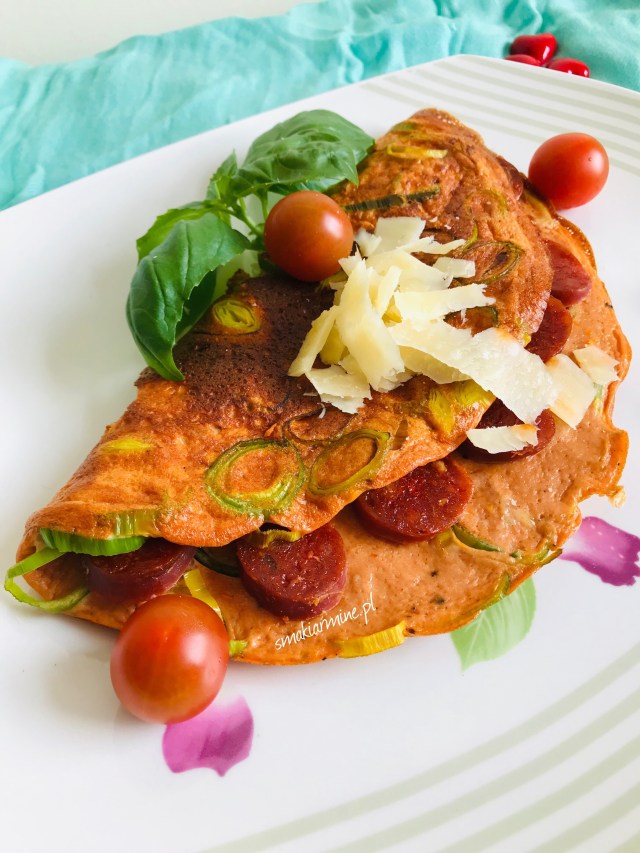 Ten omlet jest bardzo delikatny, dość pikantny, z wyraźnym posmakiem pomidorów. Chorizo i por idealnie łączą się z pomidorowym smakiem omletu i całość stanowi pyszną kompozycję na dobry początek dnia. Jeśli lubicie omlety i chętnie poznajecie nowe smaki, to koniecznie skorzystajcie z tego przepisu. Polecam