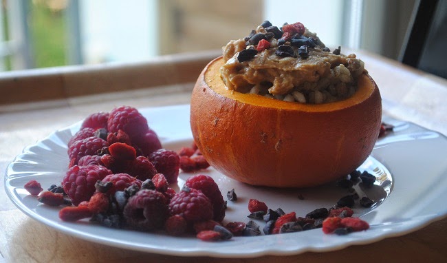 660. Pęczak w dyni z PB, maliny + bananowy koktajl z chia i maca