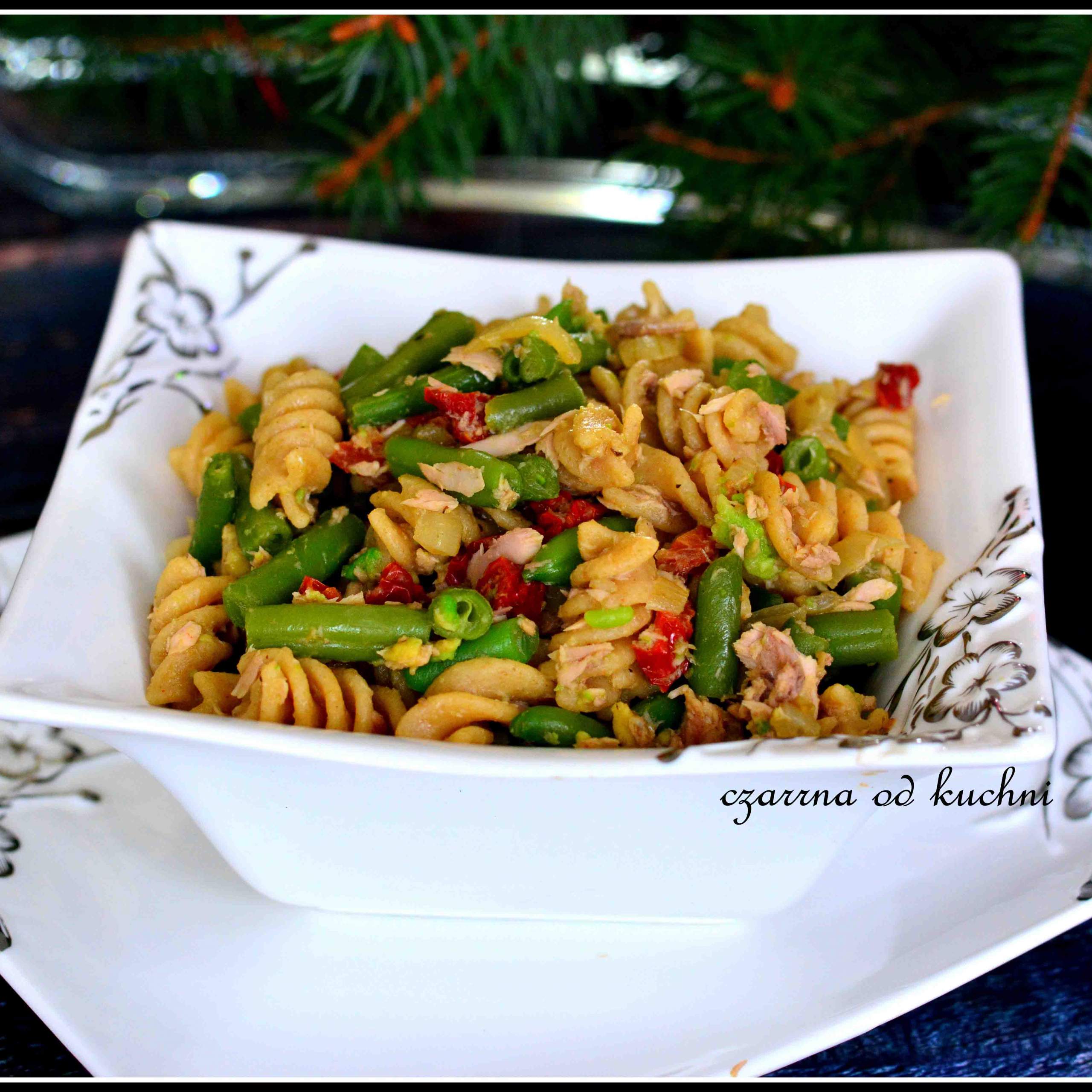 Składniki: 200 g makaronu pełnoziarnistego 200 g mrożonej fasolki szparagowej 20 suszonych…