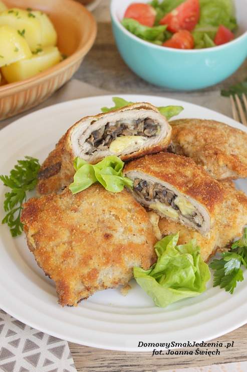 składniki: 6 porcji schabu ok. 300 g pieczarek 100 g sera żółtego…