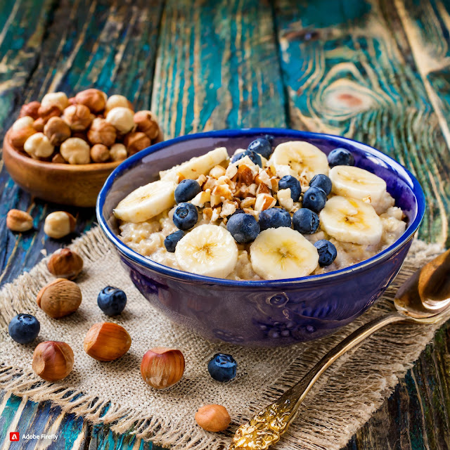 Owsianka z borówkami, bananem i orzechami laskowymi / Oatmeal with blueberries, banana and hazelnuts