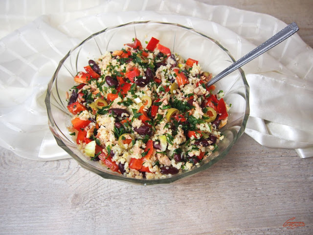 1 puszka tuńczyka w oleju1 puszka czerwonej fasoli1 czerwona papryka1 mała cebulapół słoika zielonych oliwekpół