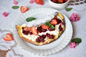 Mój omlet na słodko przygotowałam wraz z waniliowym twarogiem, dżemem wiśniowym oraz pokrojonymi truskawkami. Równie dobrze możesz go podać z samym dżemem oraz ulubionymi sezonowymi owocami.