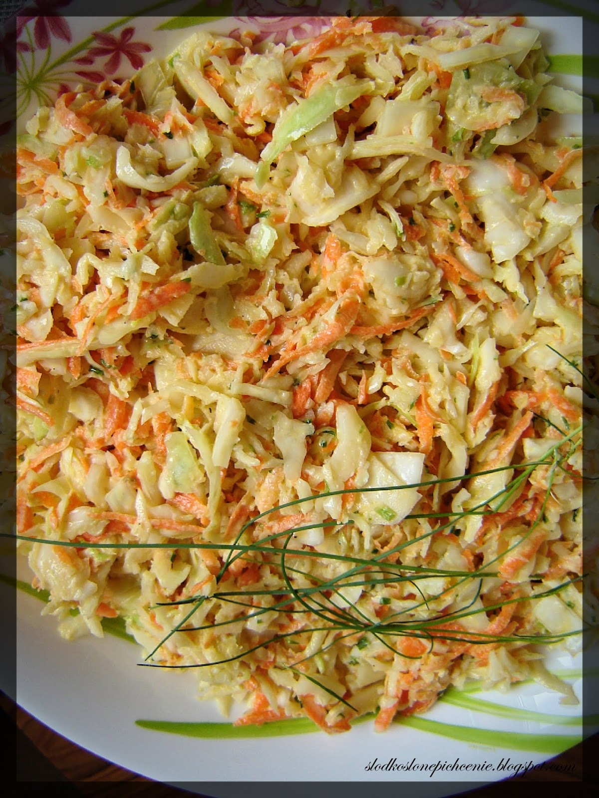 Pyszna, wyrazista w smaku surówka do obiadu z białej kapusty z marchewką i szczypiorkiem, z dodatkiem pysznego sosu na bazie oliwy z oliwek, majonezu, musztardy, czosnku i octu winnego.