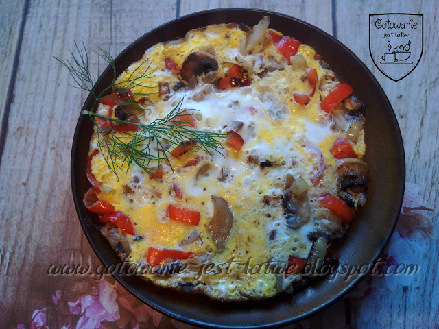 4 pieczarkikawałek czerwonej papryki1/4 cebulisólpieprz2 jajkakoperektłuszcz do smażenia Pieczarki kroimy w plasterki…