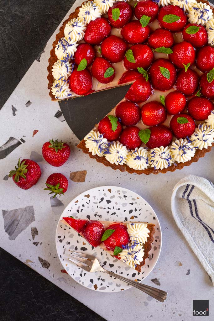 Tarta z truskawkami, miętą, kremem waniliowym i bitą śmietaną