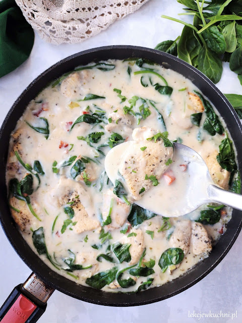 Kurczak w sosie śmietanowym ze szpinakiem i boczkiem