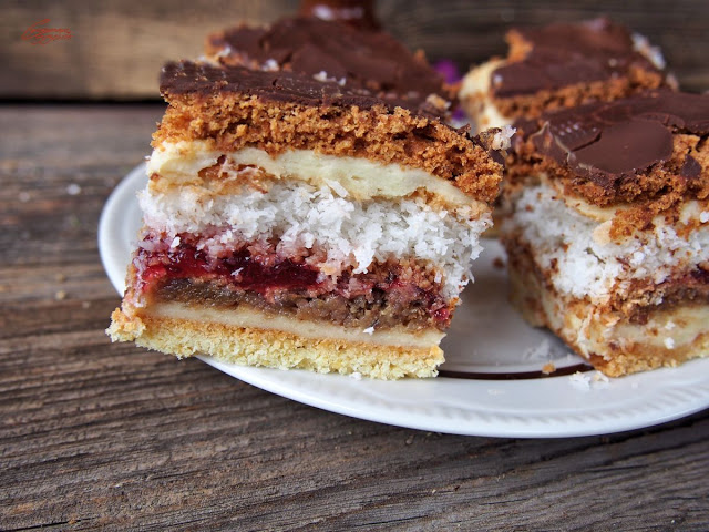 Takiego pysznego przekładańca mam dziś dla Was, bez orzechowa i beza kokosowa połączone dżemem, a jakby tego było jeszcze mało to jest krem budyniowy, ciasto kruche i polewa czekoladowa. Mówię Wam pychota. Owszem wymaga całkiem sporo pracy, ale smak wszystko wynagradza. Na zdjęciach wygląda trochę jakby na