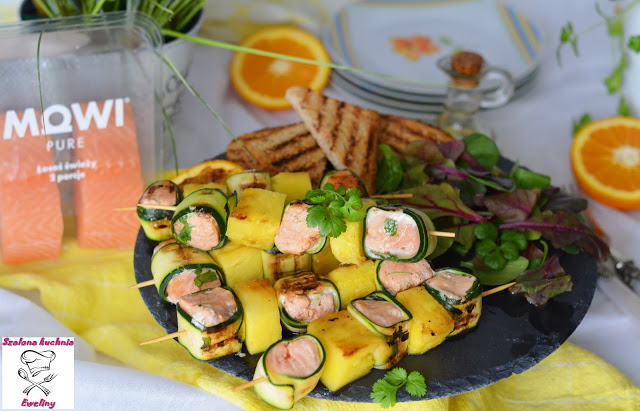 Nadziane na szpikulce kawałki soczystego, kruchego łososia z cytrusową nutą, owinięte delikatną, chrupiącą cukinią, w towarzystwie słodkiego, egzotycznego ananasa to moja propozycja dietetycznego, grillowanego dania z rybą w roli głównej.