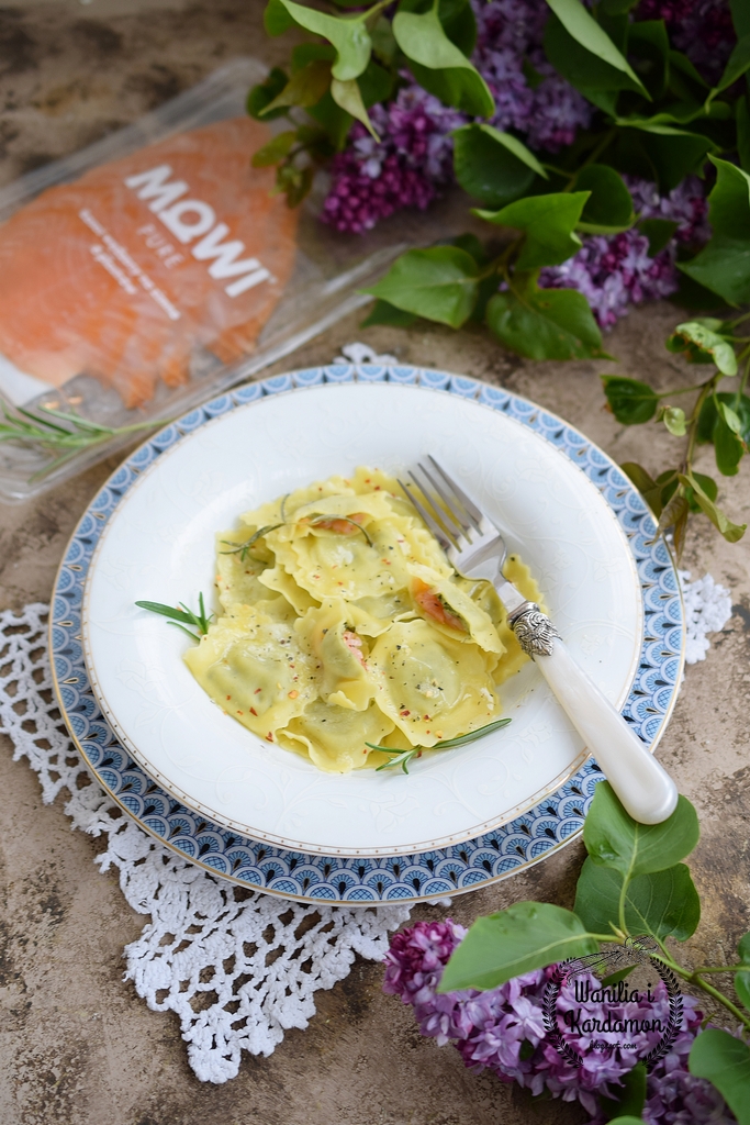 Pierożki ravioli, małe cuda na jeden kęs nadziewane serem ricotta z wędzonym łososiem Mowi i szpinakiem, polane palonym masłem z nutą rozmarynu.