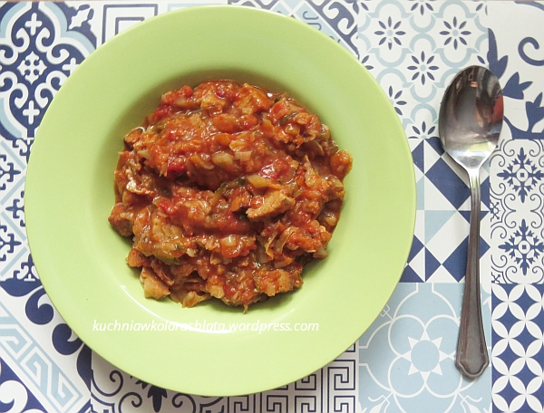 Bigos powstał w ramach domowej akcji pt. gotowanie z resztek. Do bigosu użyłam mięso z żeberek wieprzowych pozostałych po gotowaniu wywaru na zupę ogórkową oraz środków kapust, które użyłam 2 dni wcześniej do gołąbków. Gołąbki z młodej kapusty polecam, a środkowych liści można nie wyrzucać i zastąpić nimi główkę całej