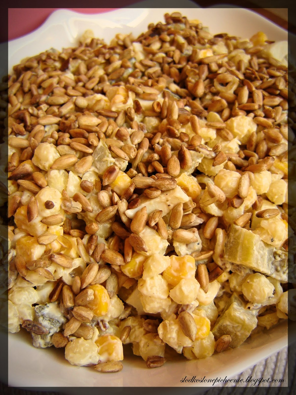 Makaronowa sałatka z dodatkiem jajek, kukurydzy, ogórków konserwowych i prażonych ziaren słonecznika.
