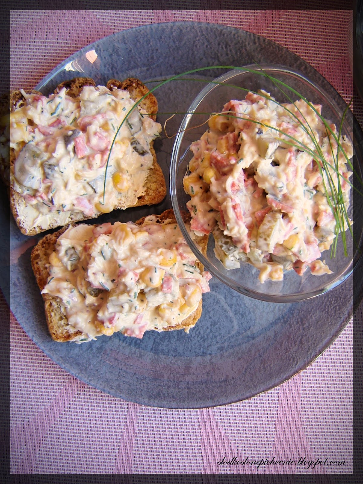 Smakowita pasta kanapkowa z żółtym serem, salami, czerwoną cebulą, kukurydzą i ogórkami konserwowymi.