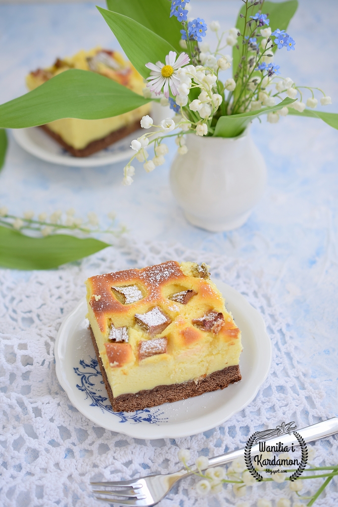 Pyszny kremowy sernik z tych tradycyjnych z wiosennym rabarbarem na kruchym spodzie. Idealny wypiek do filiżanki gorącej herbaty na weekendowy poczęstunek. Polecam gorąco, jeden z lepszych serników, zamiast rabarbaru można dać truskawki.