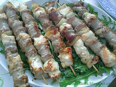 Szaszłyki na patelni z kiełbasy, piersi kurczaka,słoniny i cebuli