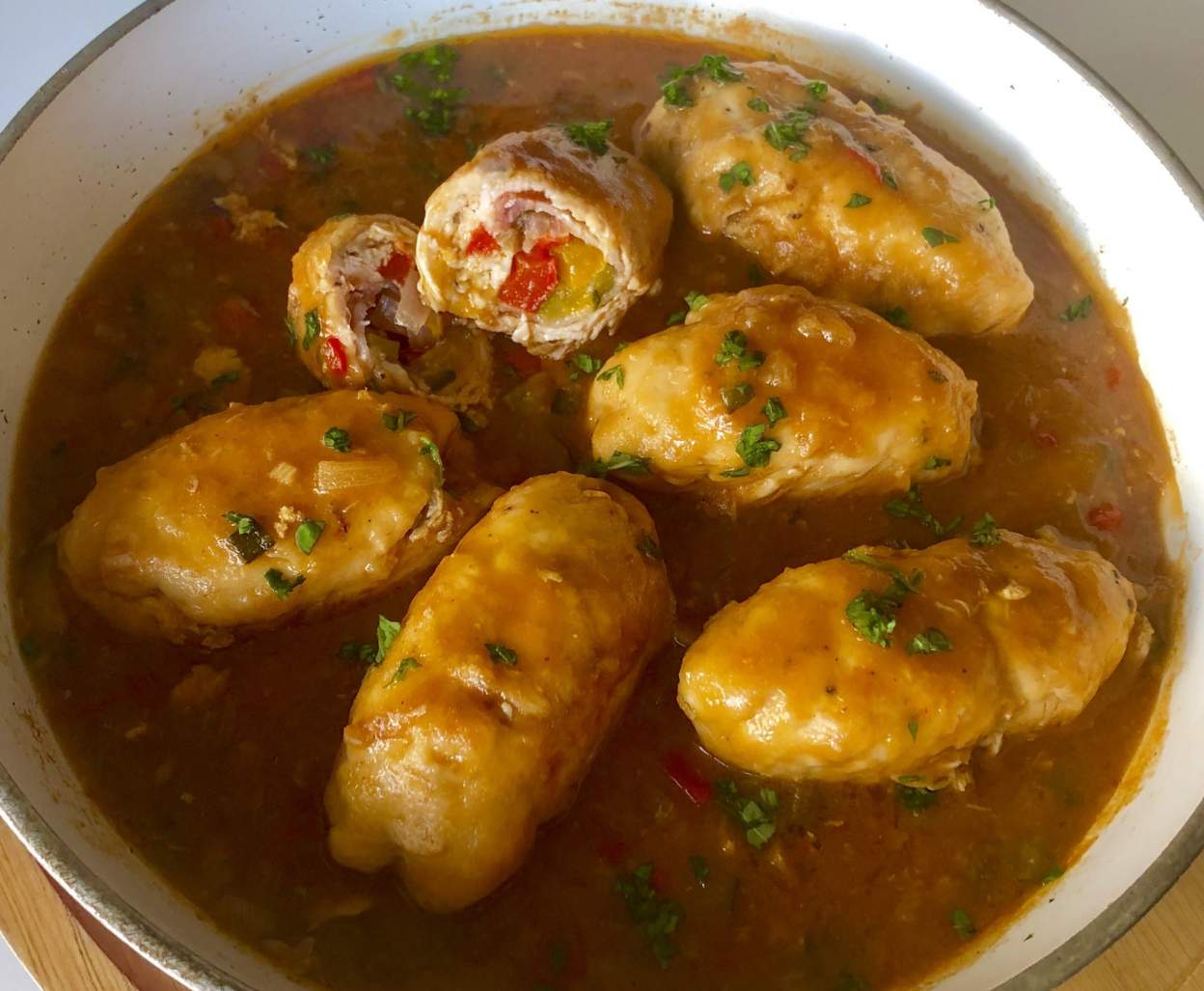 Kruche i aromatyczne roladki z kurczaka, wypełnione warzywnym farszem oraz boczkiem wędzonym i zanurzone w aromatycznym sosie, to świetny pomysł na smaczny i niecodzienny obiad. Polecam!