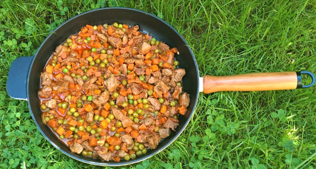 Skład: 500 g mięsa, 400 g groszku z marchewką, 2 cebule, 3-5 ząbków czosnku,1/3 kostki masła,sól, pieprz, papryka, ziele, liść, zioła prowansalskie, gałka muszkatołowa, 2 szkl.wody lub bulionu.