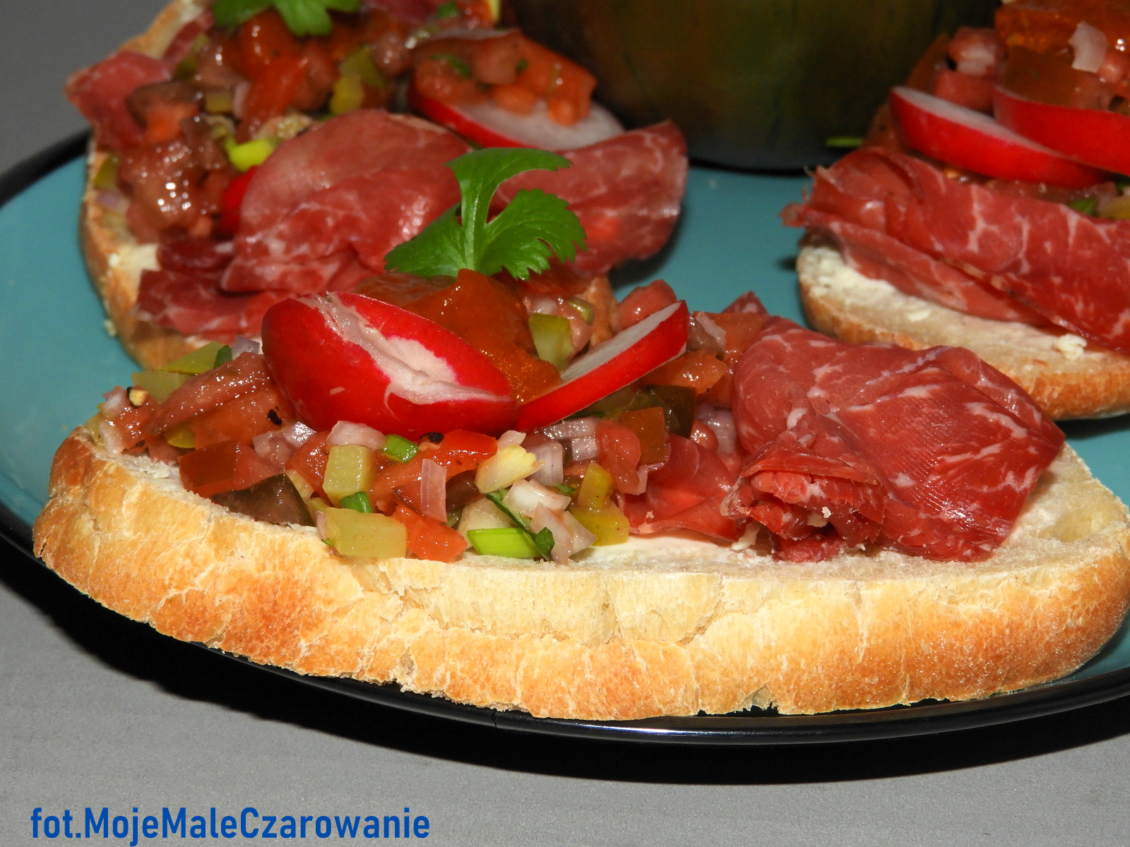 Szynka Bresaola i czekoladowe pomidory na kanapce.