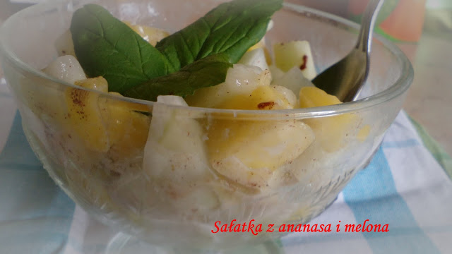 Sałatka z ananasa i melona z sosem cynamonowym.