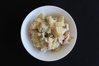 Klasyczną niemiecką sałatkę ziemniaczaną (Kartoffelsalat) zapewne większość z Was kojarzy. Postanowiłam ją urozmaicić idąc jeszcze bardziej w gust mojego Lubego. Dodatek wędzonego boczku, który zresztą idealnie pasuje, dodaje sałatce trochę charakteru i świetnego posmaku. Sałatkę ziemniaczaną polecam zwłaszcza jako dodatek do obiadowych mięs zamiast klasycznych ziemniaków.