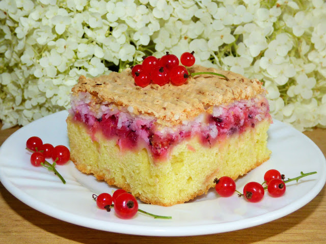 Czy znajdą się u Was na krzaczkach porzeczki? Jeśli tak, to zapraszam na szybkie ciacho słodko kwaśne z bezą kokosową.