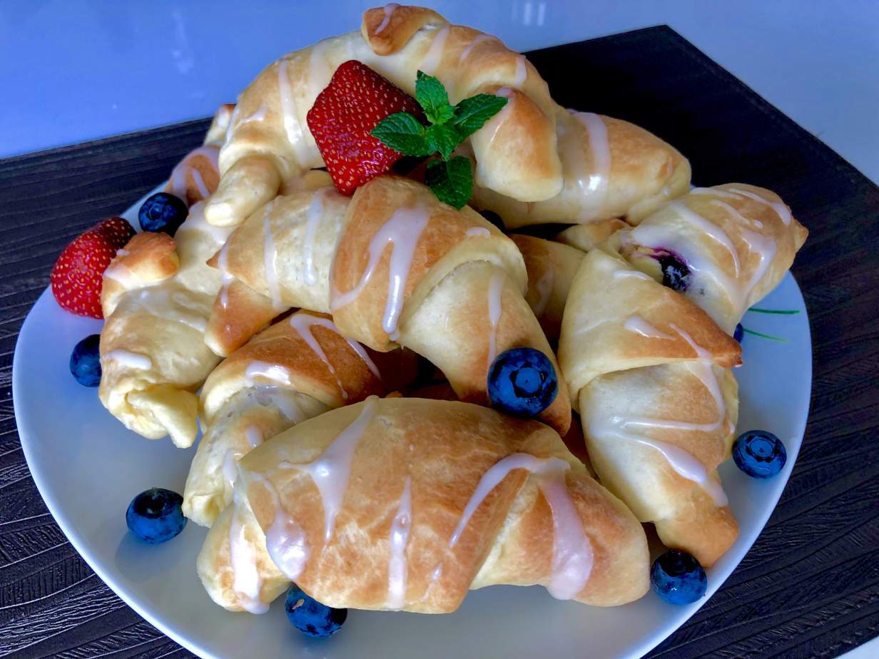 Puszyste i mięciutkie rogaliki wypełnione serkiem i jagodami. Mega smaczne, a do tego łatwe i szybkie w przygotowaniu. Polecam!