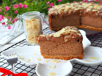 Sernik czekoladowy z masą serową o smaku advocata, na spodzie z herbatników oraz kremem czekoladowo-advocatowym i płatkami migdałowymi na wierzchu. Smak i aromat advocata jest lekko wyczuwalny, a uzyskałam go poprzez rozpuszczenie pralinek o tym smaku w śmietance kremówce. Śmietanka wpływa również na smak oraz konsystencję tego sernika, dzięki temu
