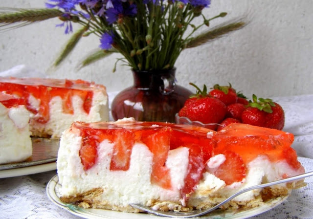 galaretka truskawkowa 1 opakowanie, gorąca woda 450 ml, herbatniki 150 gram, truskawki świeże 60 dag duże