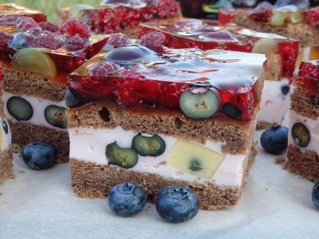 Tworzyłam i tworzyłam i stworzyłam takie oto ciasto pełne owoców. Ciasto to zlepek kilku przepisów. Z jednego wykorzystałam biszkopt, z drugiego pomysł na masę i jeszcze jest też coś z sernika na zimno. Wyszło coś pysznego, cieszy oko i nie takie trudne w przygotowaniu. Można wykorzystać dowolne owoce i dowolne