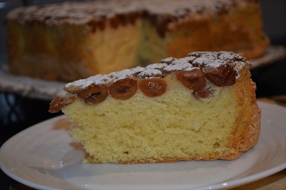 Delikatne, puszyste ciasto biszkoptowe, w którym zanurzone są soczyste owoce. Fenomen tego ciasta polega na tym, że mogą to być każde owoce świeże lub mrożone. U mnie tym razem padło na mrożone czereśnie.