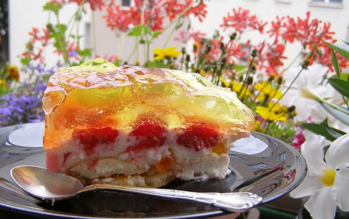 sernik na zimno z galaretkami,malinami,biszkoptami…