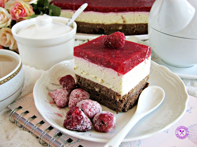 Ciasto składa się z kilku warstw. Zasadniczo jest bardzo proste w przygotowaniu i nie wymaga zbyt dużo pracy. Spód stanowi czekoladowe brownie, następne warstwy to chrupiąca kakaowa pralina i puszysta masa śmietankowa z białą czekoladą. Wierzch wykańcza galaretka z malinami. Całość jest obłędnie pyszna!
