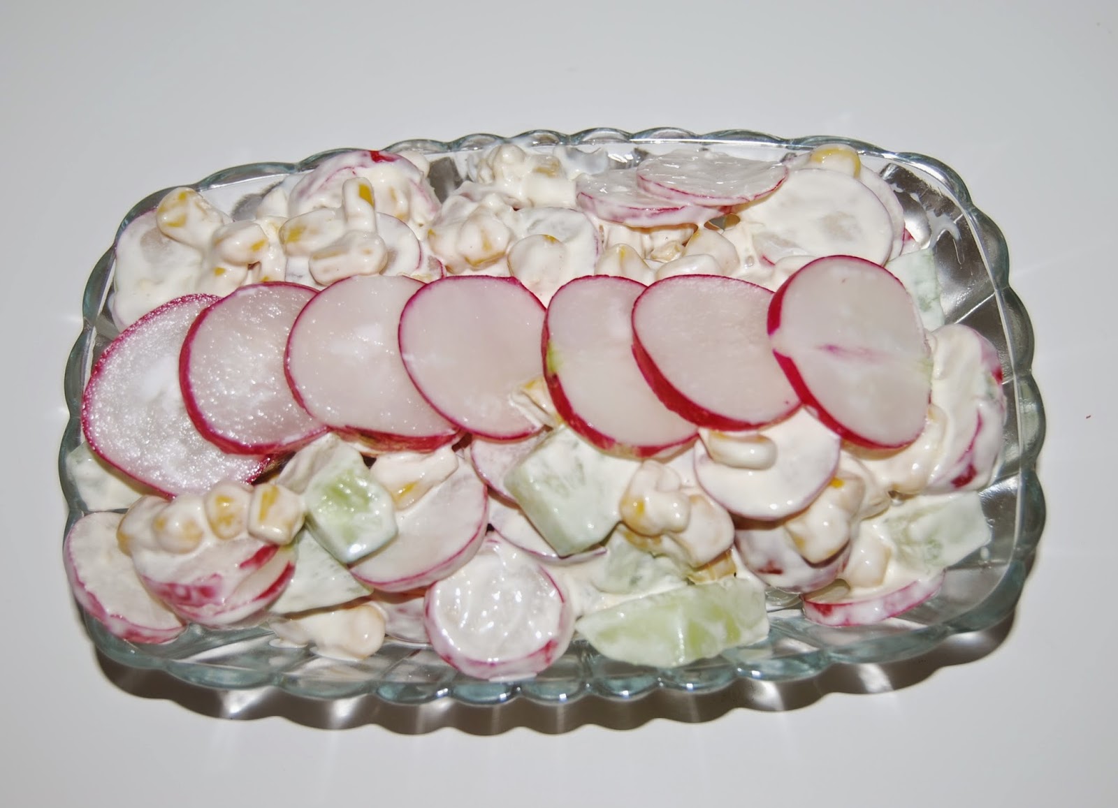 Składniki: 1 pęczek rzodkiewki1 puszka kukurydzy1 długi ogórek7 pomidorków koktajlowych3 łyżki majonezusólpieprz…