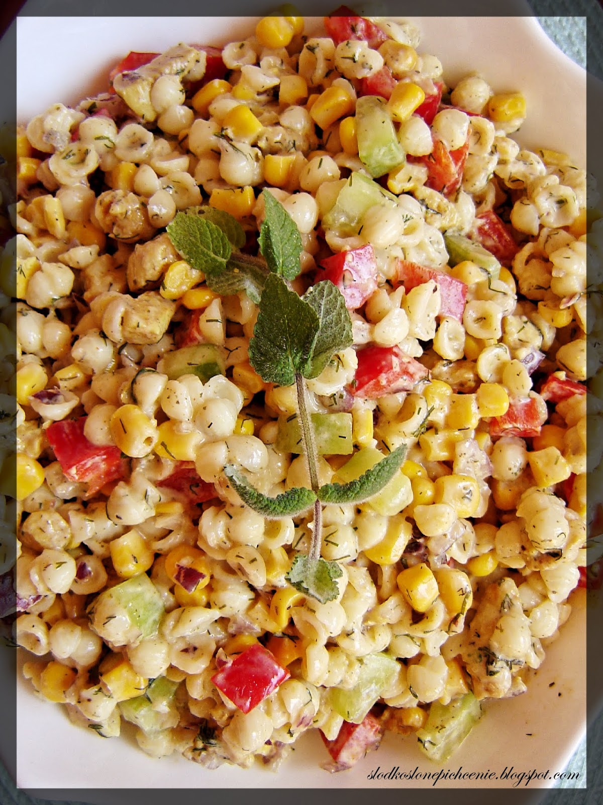 Sałatka makaronowa z kurczakiem, ogórkiem, papryką, czerwoną cebulą i kukurydzą to doskonały pomysł na kolację lub imprezę.