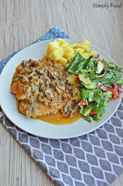 Taki tradycyjny, bardzo smaczny obiad: mięciutki schab w sosie pieczarkowym do tego ziemniaczki z wody i surówka z mixu sałat, ogórka, pomidora oraz dressingu musztardowego. Wszystko czego potrzeba żeby zaspokoić apetyt i ochotę na pyszny posiłek 🙂