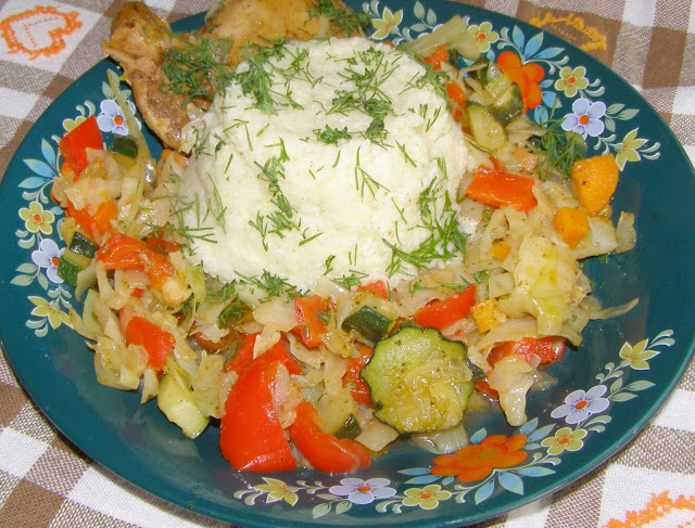 kasza jaglana 2 szklanki, olej rzepakowy 1/2 szklanki, cebula 1 sztuka duża, cukier 1 łyżeczka, marchew młoda 5 sztuk, kapusta młoda 1/2 główki lub 1 mniejsza, papryka czerwona 3 sztuki, cukinia 2 sztuki średnie, przyprawa do kebab-gyros 1 opakowanie, pieprz cayenne 1 łyżeczka, kostka rosołowa 1 sztuka, pieprz