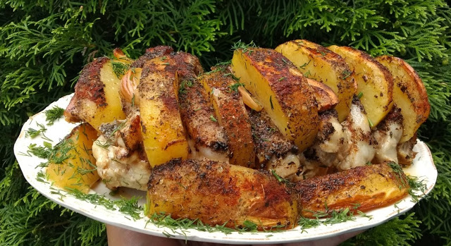 Skład: schab 1,5-2 kg, ziemniaki 0,5-0,8 kg, 3 cebule, 4 z. czosnku, 50-70g smalcu.Przyprawy: sól, pieprz, papryka, zioła prowansalskie…(opcjonalnie swoje ulubione)