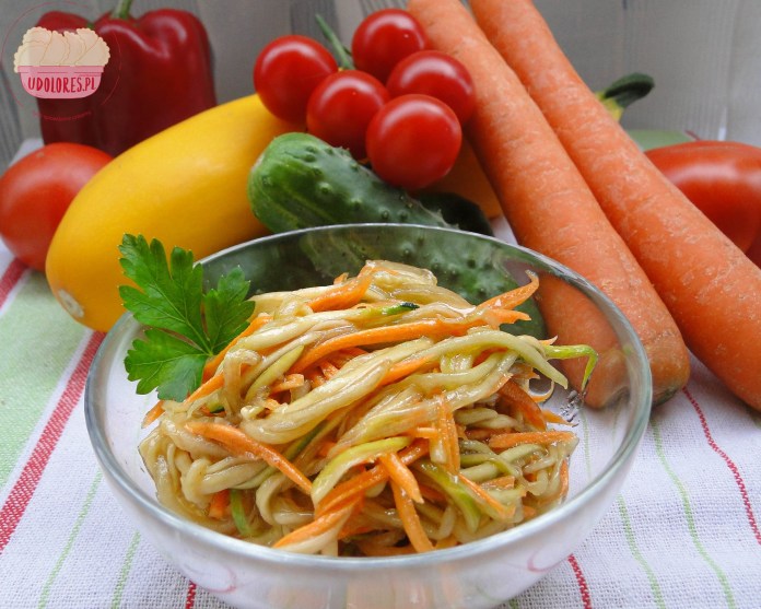 3 cukinie2 marchewki4 duże ogórki70 ml. octu2 łyżki miodu1/2 szkl. oleju3 łyżki