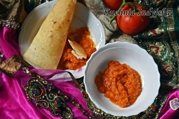 Chutney z cukinii i pomidora, to nie do końca danie typowo indyjskie, ponieważ cukinia nie jest warzywem, które w tej kuchni często gości. A nawet pokusiłabym się o stwierdzenie, że raczej nigdy. Bardziej popularny jest już bakłażan, a szczególnie mniejsza odmiana, wielkości mniej więcej większego pomidora. Jest to bakłażan