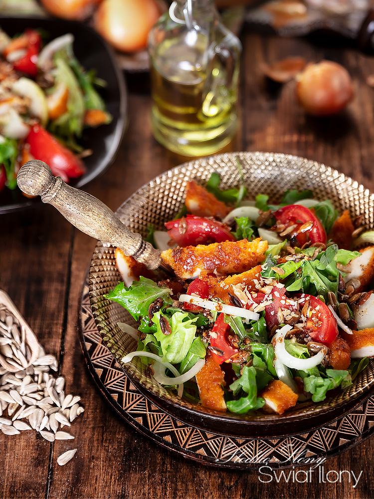 Szybka i pożywna propozycja na pyszny obiad lub kolację – chrupiąca rukola o lekko orzechowym posmaku, panierowany w płatkach kukurydzianych kurczak, soczyste pomidory, świeża cebula, prażony słonecznik i tarty parmezan… Czyż to nie brzmi wspaniale…? 😋 Całość tworzy przepyszną sałatkę, szybką do zrobienia, z łatwo dostępnych składników. Mimo to
