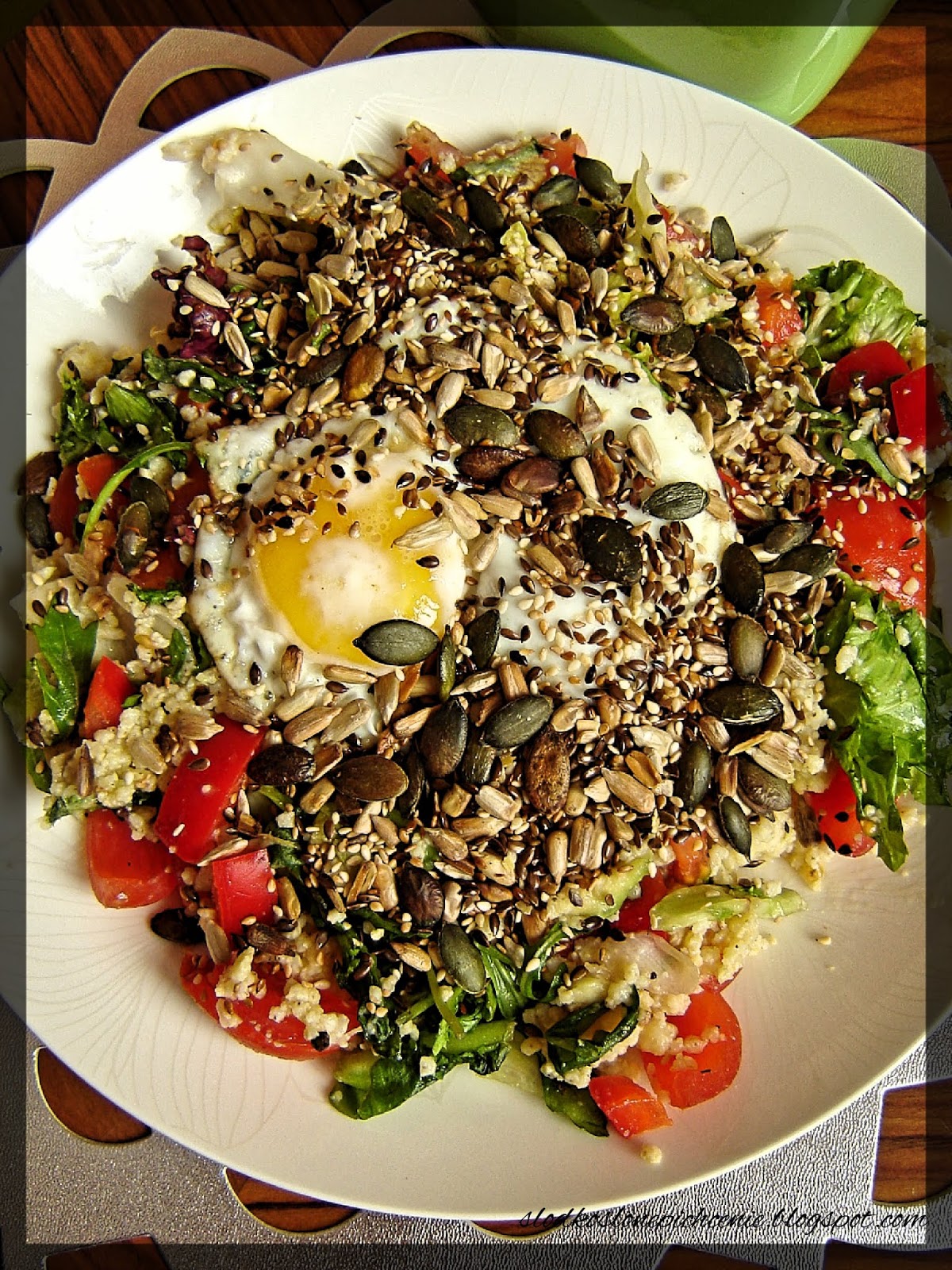 Pożywna sałatka na bazie kaszy jaglanej z dodatkiem awokado, papryki i pomidorków koktajlowych, której smak doskonale uzupełnia jajko sadzone.