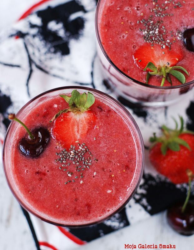 Koktajl z czereśniami i dużą ilością owoców, w postaci banana, pomarańczy i…