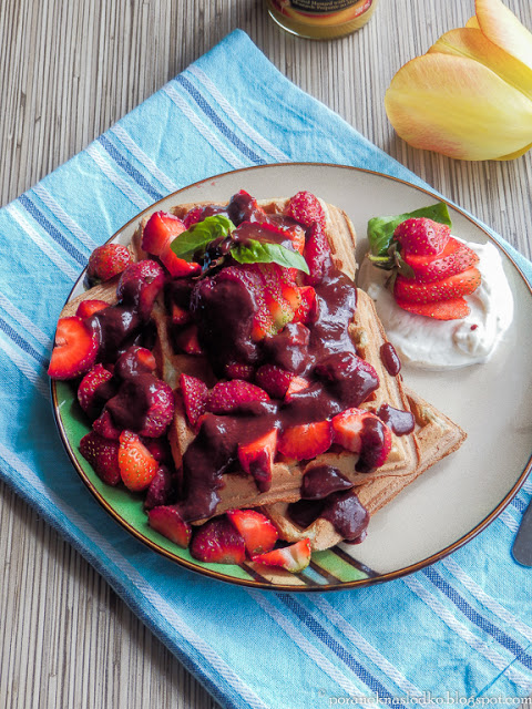 Miodowe* wegańskie gofry ziemniaczane z zamiennikiem jajka (Ecoland) podane z kokosowym mascarpone…