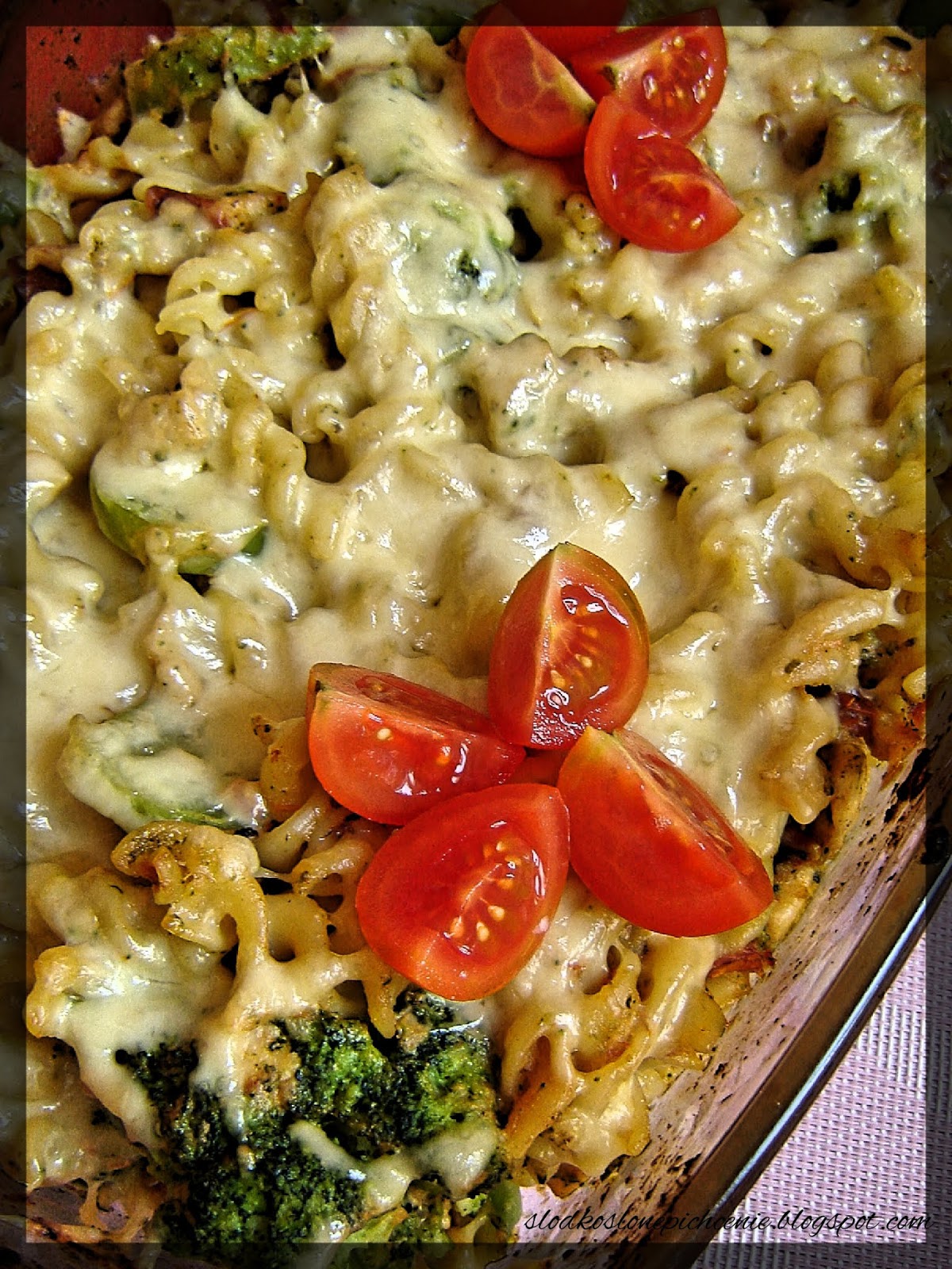 Doskonała na obiad lub kolację zapiekanka makaronowa z kurczakiem, brokułem i suszonymi pomidorami. 🙂