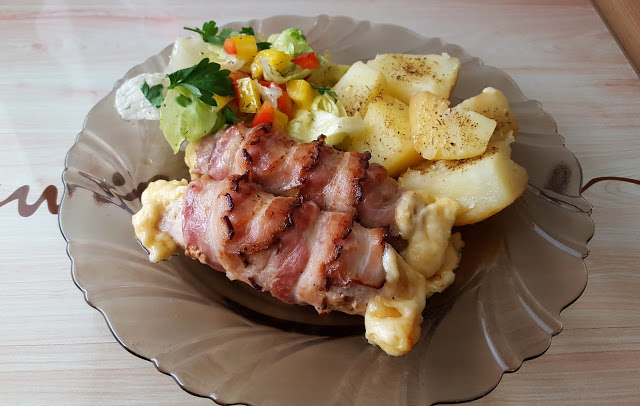 Roladki schabowe w boczku, faszerowane żółtym serem i zapieczone w piekarniku wraz…